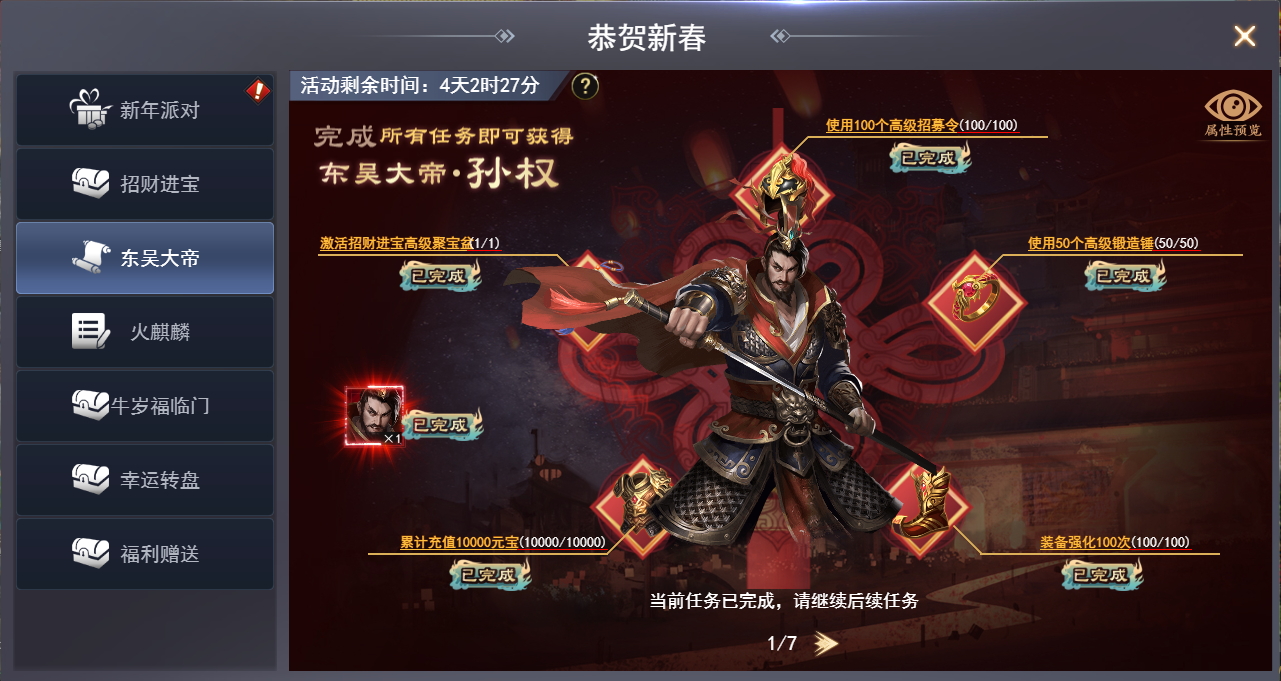 2、完成当前所有任务可解锁下面任务,共可获得1200孙权将魂。