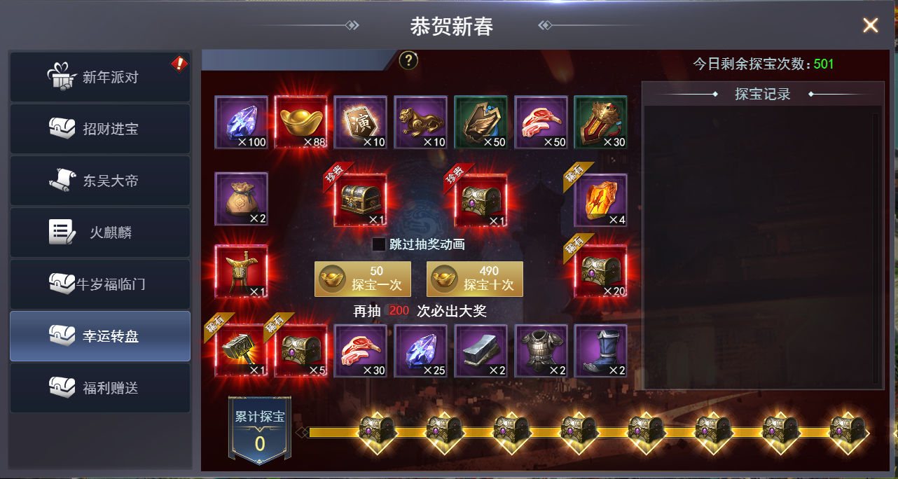 1、 每日可免费抽奖1次,第二次可花费5折元宝抽奖,之后50元宝抽取1次,490元宝抽取10次。