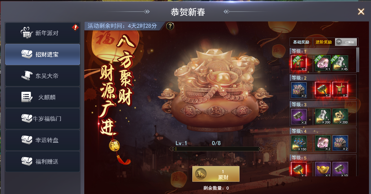4、当聚宝盆等级到达最高级时,使用金蟾可获得其他奖励。