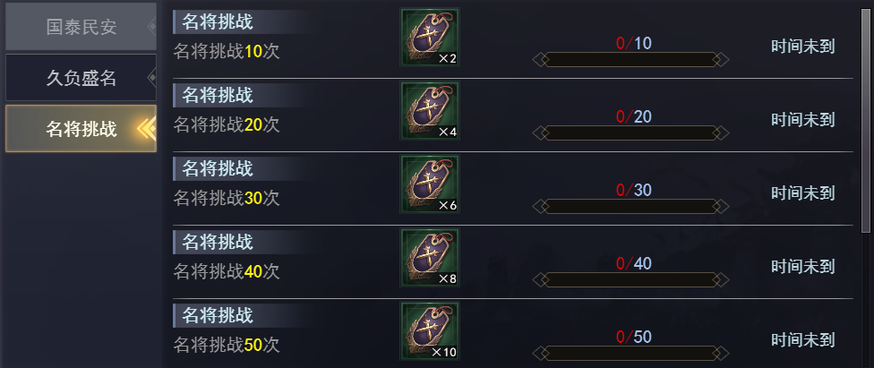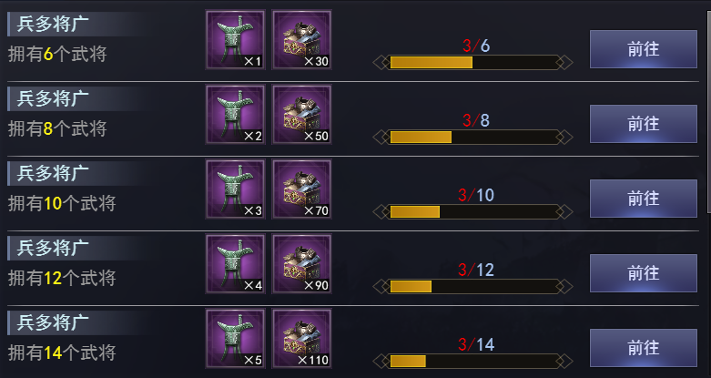 | 拥有10个武将 | 普通招募令 | 3 | 粗制兵统随机包 | 70 |