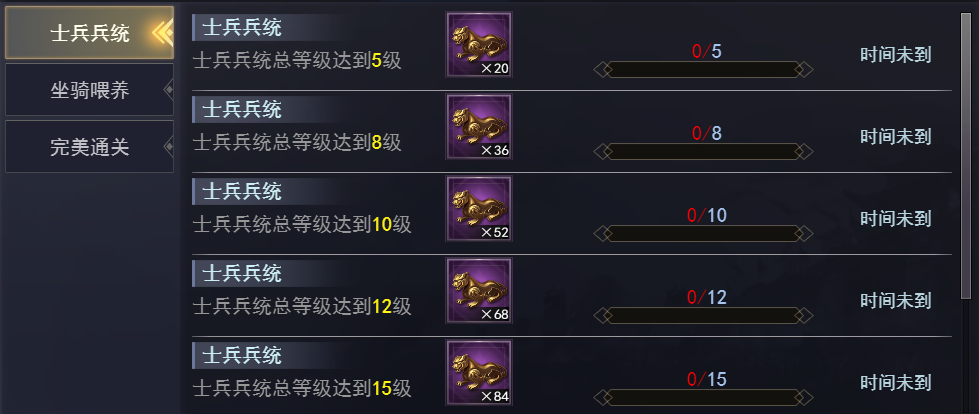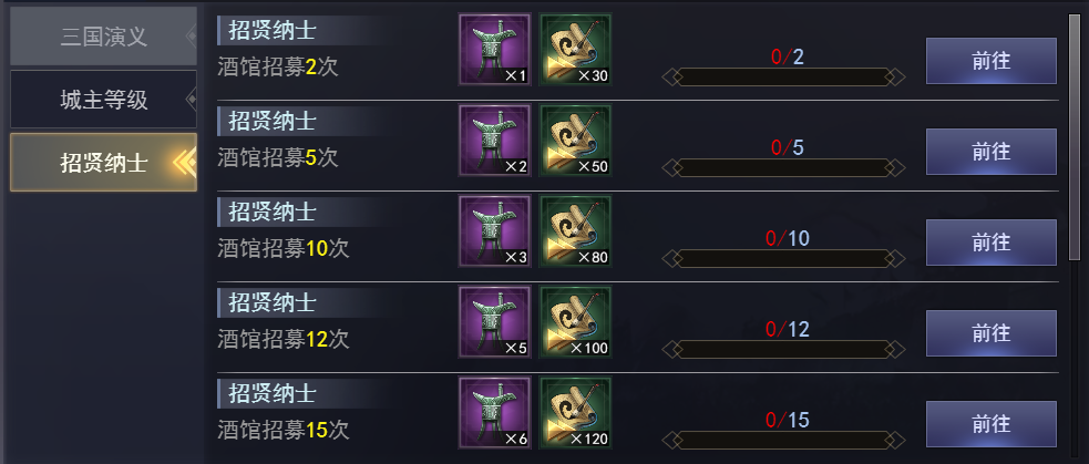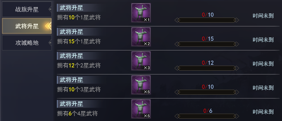 | 拥有6个武将 | 普通招募令 | 1 | 粗制兵统随机包 | 30 |