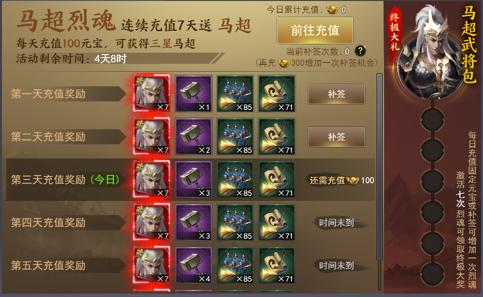 活动期间未充值达到100元宝的天数均可补签(当天充值每多300元宝可补签1次)