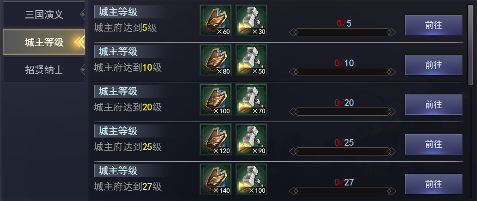 | 城主府达到30级 | 突飞令 | 160 | 建造加速符 | 120 |